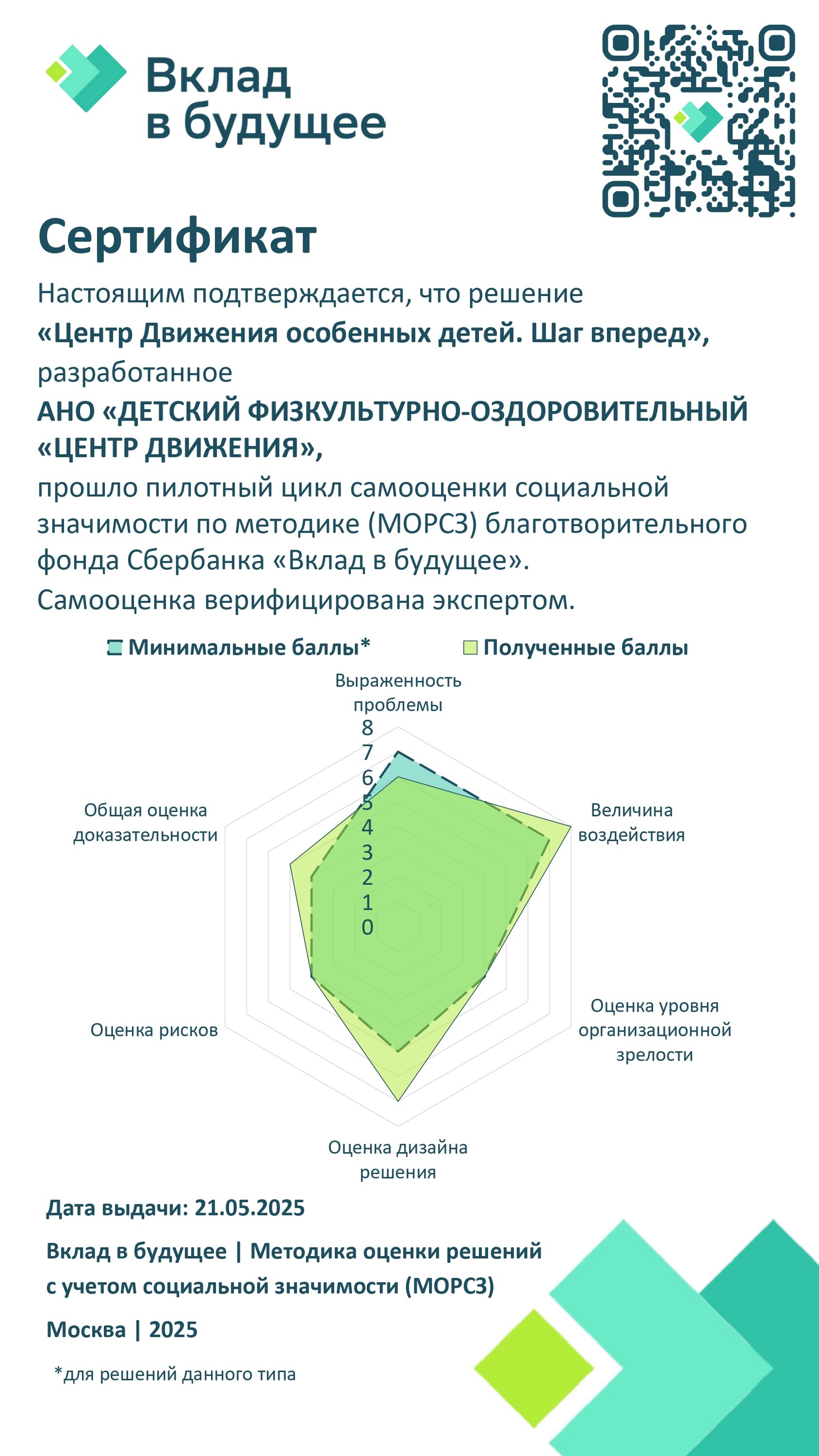 АСНО «Детский физкультурно-оздоровительный «Центр Движения» прошло в 2025 году самооценку социальной значимости по методике МОРСЗ БФ Сбербанка «Вклад в будущее»